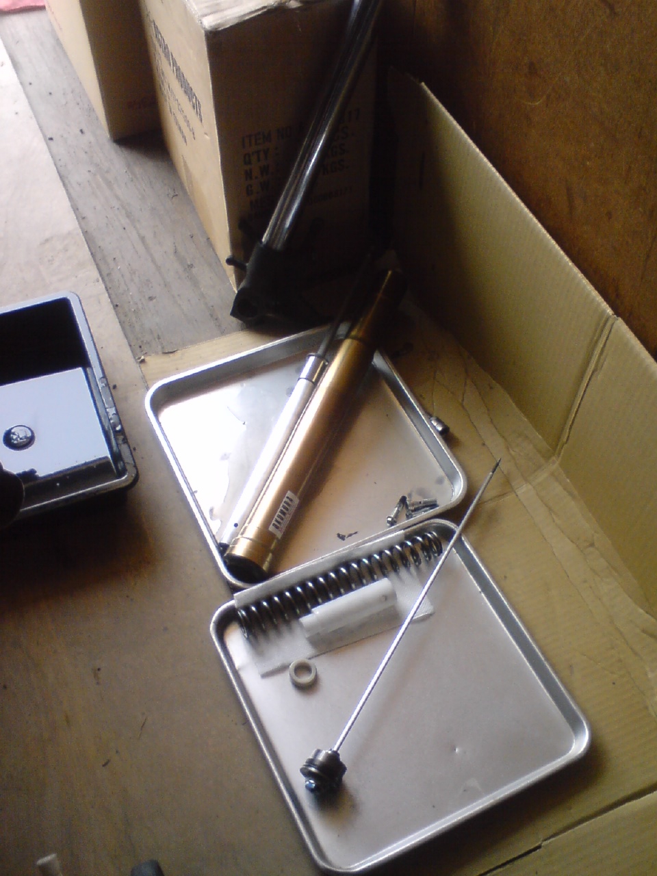 昨日は会社に行く前に分解されたフロントフォークを合体させるべくガレージへ